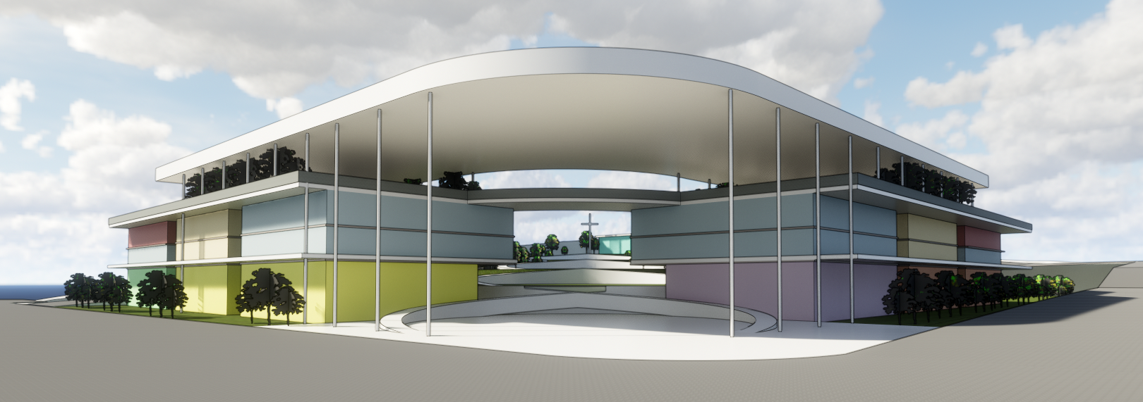 McVeigh designed a solution that provides separation between traffic and parking zones and student areas as well as providing community access and public space through the central pedestrian axis.
